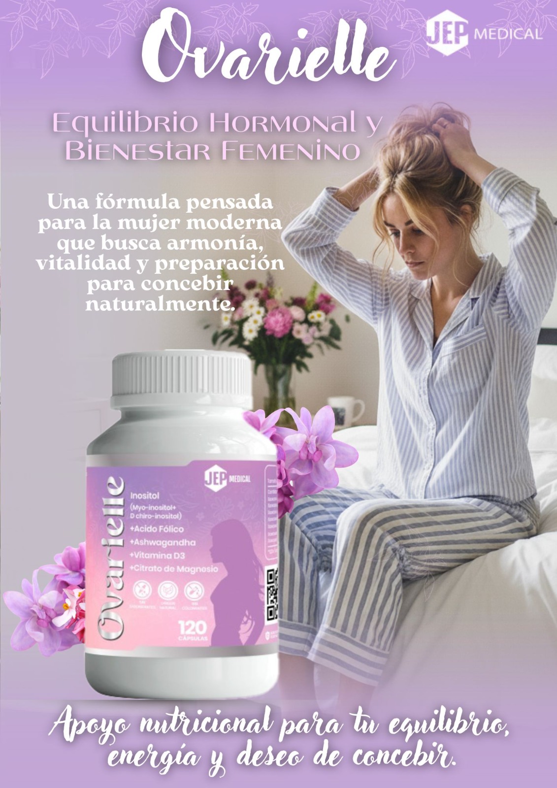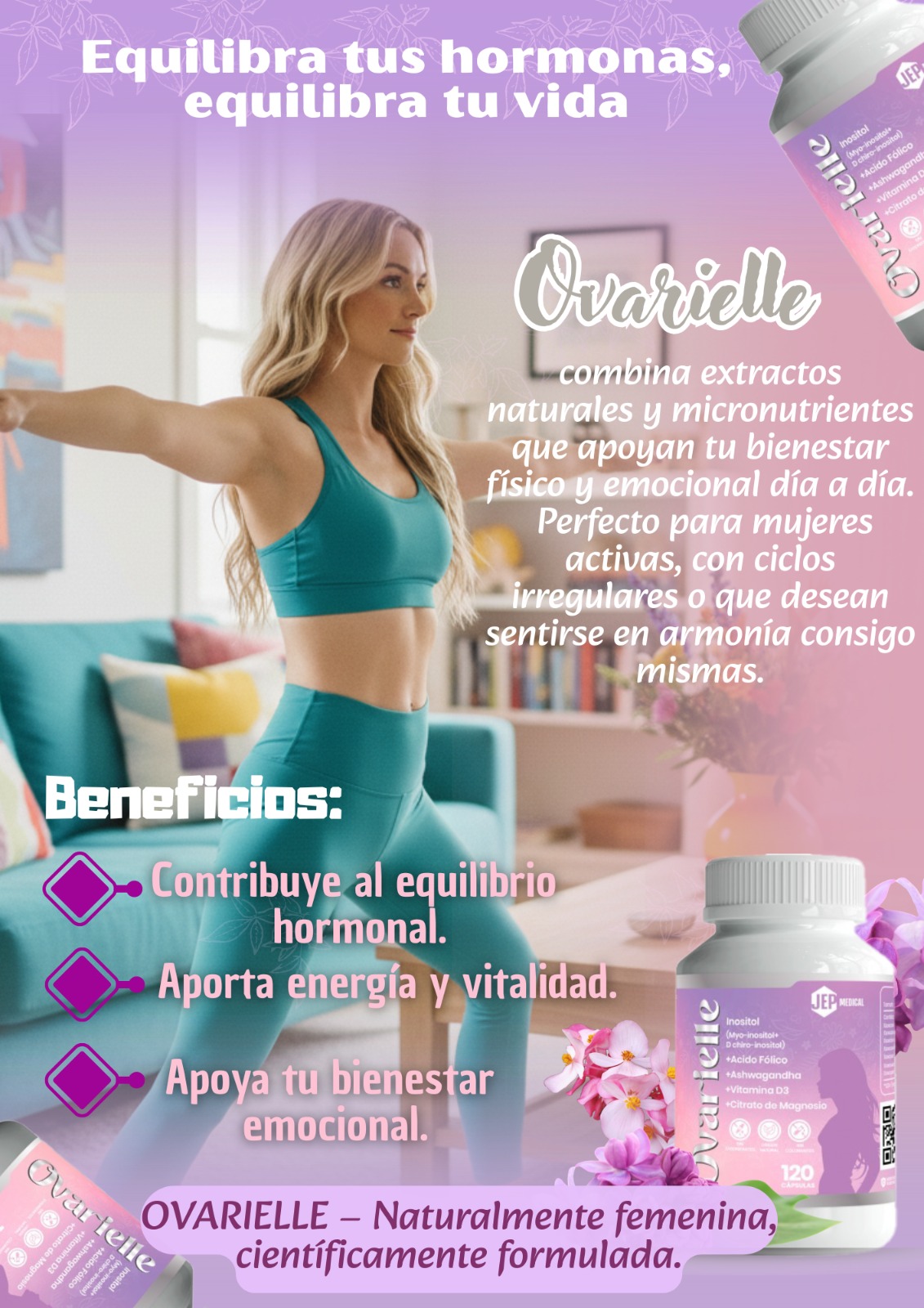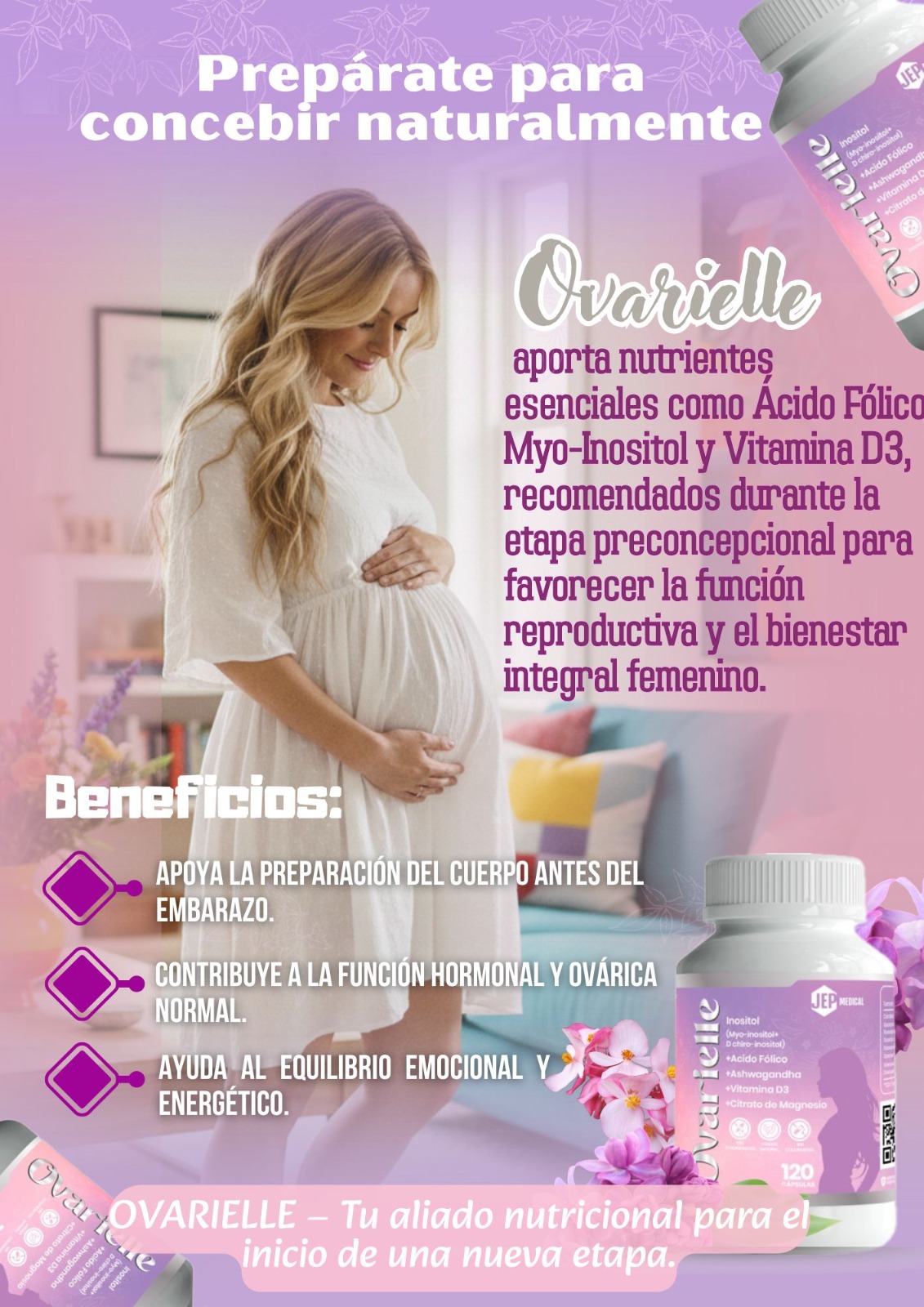 Con Vitamina D, Vitamina B9 (Ácido Fólico), Magnesio, Inositol, Harina de Soya (fuente de D-Chiro Inositol) y Ashwagandha.